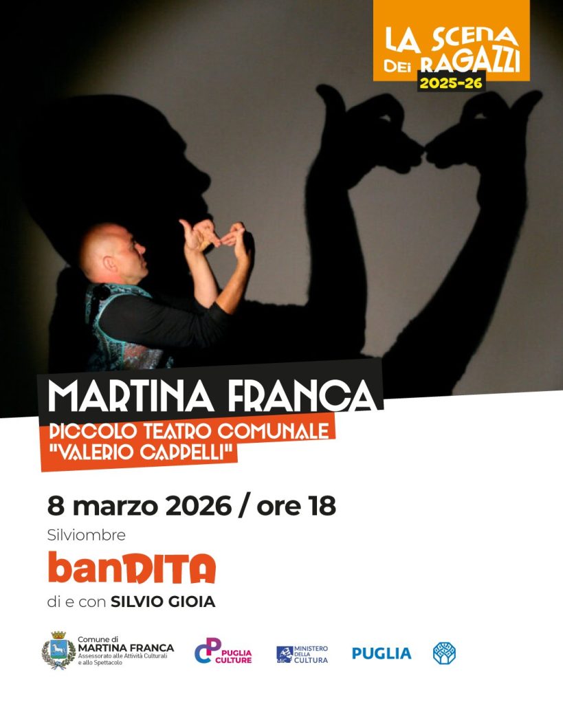 Domenica 8 marzo a Martina Franca va in scena banDITA Silviombre Martina Franca, lo spettacolo di teatro d’ombre dedicato a bambini e famiglie. L’appuntamento è alle 18, al Piccolo Teatro Comunale “Valerio Cappelli”. L’evento rientra nel quarto appuntamento della rassegna “Il sorriso è di casa! Kids”, organizzata dal Comune di Martina Franca tramite l’Assessorato alle Attività Culturali e allo Spettacolo.