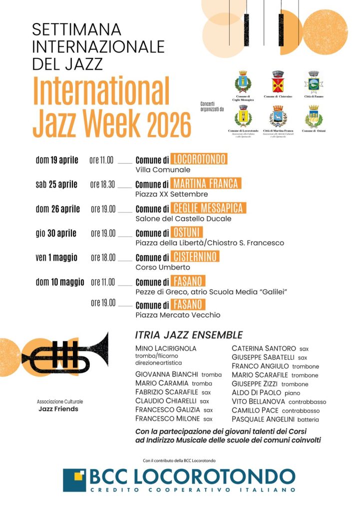 L’iniziativa si inserisce nel calendario legato all’International Jazz Day, la ricorrenza istituita dall’UNESCO per riconoscere al jazz un ruolo culturale e sociale legato al dialogo tra i popoli, alla pace e alla libertà di espressione. Anche se la data ufficiale cade il 30 aprile, il programma sul territorio è già partito il 19 aprile da Locorotondo e proseguirà fino al 10 maggio, coinvolgendo anche Ceglie Messapica, Cisternino, Ostuni e Fasano.