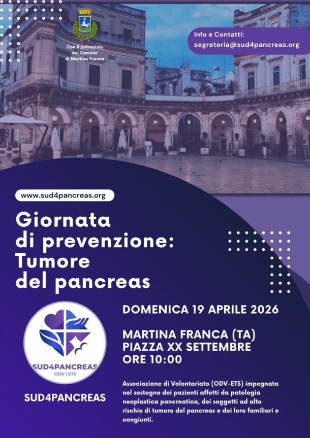 Per l’associazione, quella del 19 aprile sarà la prima occasione pubblica per farsi conoscere sul territorio. Per Martina Franca, invece, rappresenta un momento utile per aprire una discussione più ampia sui tumori pancreatici, sui fattori di rischio e sulle opportunità oggi disponibili in tema di prevenzione e diagnosi precoce. La partecipazione è aperta a tutti.